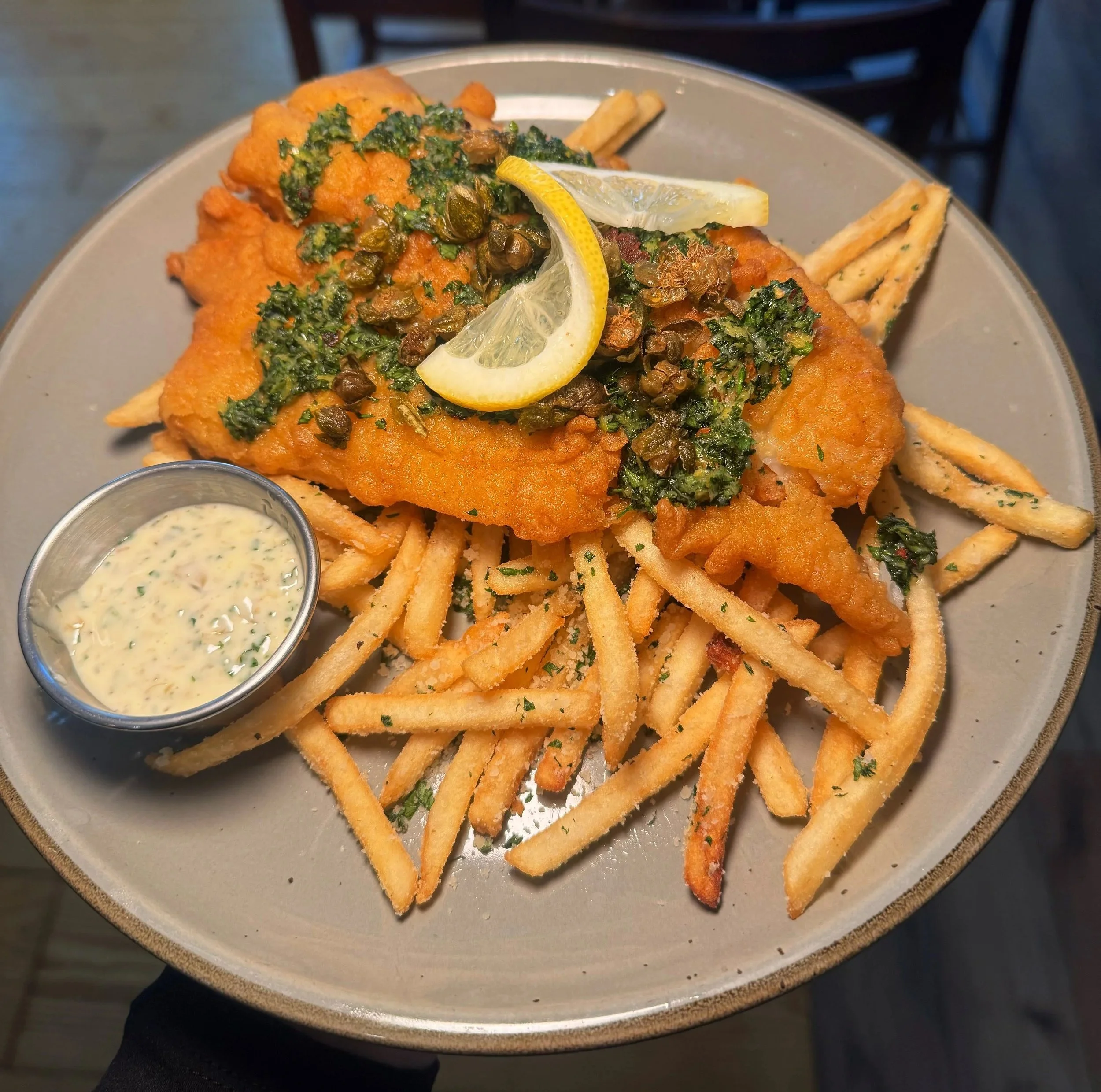 Lightly Battered Cod served with Italian-Dusted Parmesan Fries, house made Gremolata, fried capers and Primo Tartar Sauce.